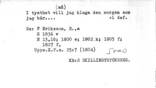//// (må) //// I tysthet vill jag klaga den sorgen som //// jag bär.... +1 def. //// Se: F Eriksson, S.,a //// E 1836 v //// N 13^18; 1800 e; 1802 k; 1805 f; //// 1827 f, //// Upps.Z.P.s. 25:7 (1804) j y-***--^ //// KB:S SKILLINGTRYCKSREG. //// ) //// t //// i //// < //// ) //// ] //// . ////