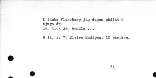 //// - //// i //// i .. „ . . //// - s - , , //// I täcka Flensburg jag dagen skådat i //// tjugo år //// dar fick jag handla ... //// B 11, s. 76 Elvira Madigan. 10 str.kom. //// } //// i' //// ! //// E- ////