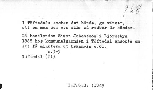 //// - — . . ' . , ... . . //// I Töftedals socken det hände, go vänner, //// att en man som oss alla så redbar är känder- //// Då handlanden Simon Johansson i Björnebyn //// 1888 hos kommunalnämnden i Töftedal ansökte om //// att få minutera ut brännvin o.öl. //// s.3-5 //// Töftedal (Dl) //// e //// H ////