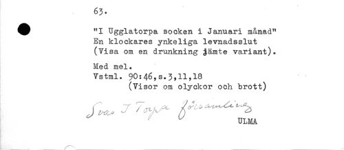 //// ^^ "I Ugglatorpa socken i Januari månad" //// En klockares ynkeliga levnadsslut //// (Visa om en drunkning järnte variant). //// Med mel. //// Vstml. 90:46,s.3,11,18 //// (Visor om olyckor oöh brott) //// j ^^ ^ ^ ^ ' /) ^ //// ULMA //// L ............. _....... .. ...... ............ ////