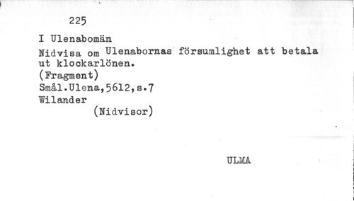 //// I Ulenabomän //// Nidvisa om Ulenabornas försumlighet att betala //// ut klockarlönen. //// (Fragment) //// Smål.Ulena,56l2,s.7 //// Wilander //// (Nidvisor) //// ULäA //// i //// < //// ! ////