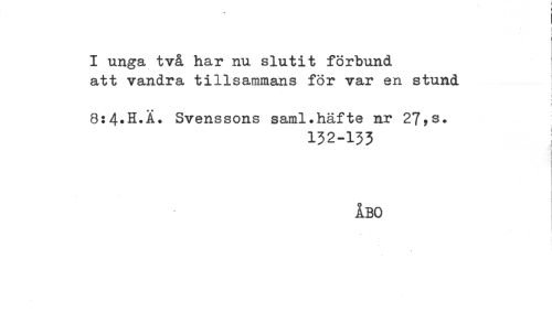 //// t //// i //// I unga två har nu slutit förbund //// att vandra tillsammans för var en stund //// i //// 8:4*H.Å. Svenssons saml.häfte nr 27?s. //// 132-133 //// . //// ÅBO ////