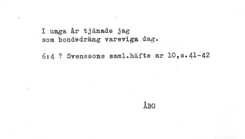 //// * //// I unga år tjänade jag //// som bondedräng vareviga dag. //// * //// 6:4 ? Svenssons saml.häfte nr 10,s.41-42 //// * //// ÅBO ////