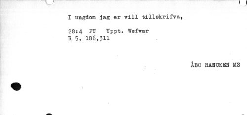 //// I ungdom jag er vill tillskrifva, //// 28:4 PU Uppt. Wefvar //// R 5, 186,3H //// ÅBO RANCKEN MS ////