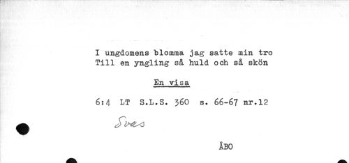//// I ungdomens blomma jag satte min tro //// Till en yngling så huld och så skön //// En visa //// 6:4 LT S.L.S. 36O s. 66-67 nr.12 ////
