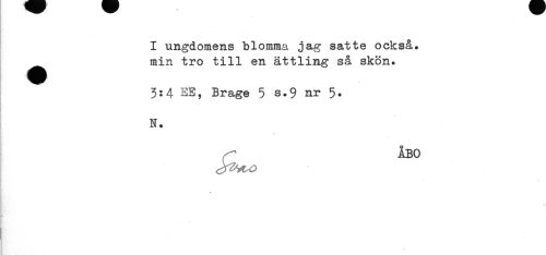 //// I ungdomens blomma jag satte också, //// min tro till en ättling så skön. //// 3:4 EE, Brage 5 s.9 nr 5. //// N. //// ÅBO ////