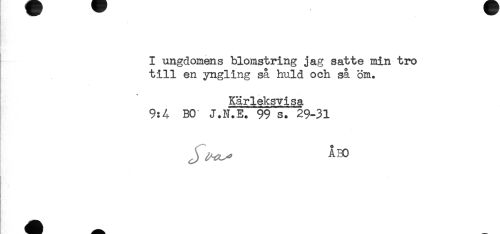//// I ungdomens blomstring jag satte min tro //// till en yngling så huld och så öm. //// * . - //// Kärleksvisa //// 9:4 BO J.N.E. 99 s. 29-31 //// Jl^ ÅBO ////