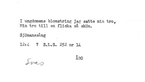 //// I ungdomens blomstring jag satte min tro. //// Min tro till en flicka så skön. //// Sjömanssång //// 12:4 ? S.L.S. 252 nr 14 //// ÅBO ////