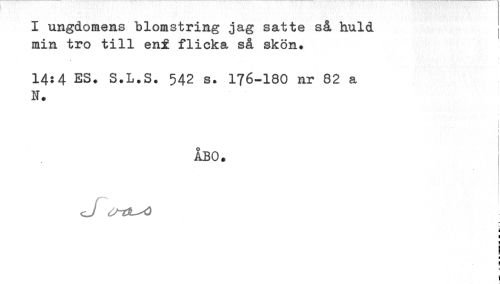 //// I ungdomens blomstring jag satte så huld //// min tro till eni flicka så skön. //// 14:4 ES. S.L.S. 542 s. I76-I8O nr 82 a //// N. //// i //// ! //// ÅBO. //// ! ////