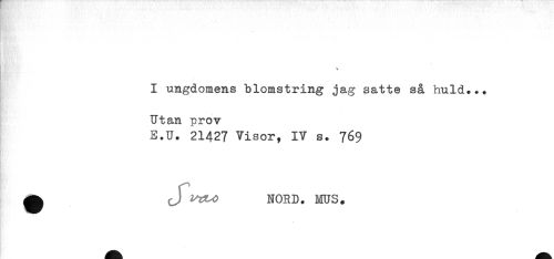 //// I ungdomens blomstring jag satte så huld... //// Utan prov //// E.U. 21427 Visor, IV s. 769 //// ^ (J NORD. nus. ////