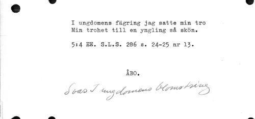 //// I ungdomens fägring jag satte min tro //// Min trohet till en yngling så skön. //// 5:4 EE. S.L.S. 286 s. 24-25 nr 13. //// * //// * //// ÅBO. //// i //// ! ////