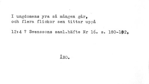 //// * //// I ungdomens yra så mången går, //// och flera flickor sen tittar uppå //// 12:4 ? Svenssons saml.häfte Nr 16. s. 180-192, //// ÅBO. ////