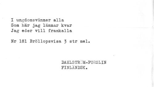 //// I ungdomsvänner alla //// Som här jag lämnar kvar //// Jag eder vill framkalla //// Nr 181 Bröllopsvisa 3 str mel. //// DAHLSTROM-FORSLIN //// FINLÄNDSK. ////