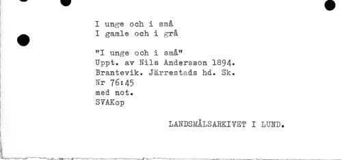 //// I unge och i små //// ^^ I gamle och i grå //// "I unge och i små" //// Uppt. av Nils Andersson 1894* //// Brantevik. Järrestads hd. Sk. //// Nr 76:45 //// med not. //// SVAKop //// LANDSAdLSARKITET I LUND. //// L,^ _______ ////