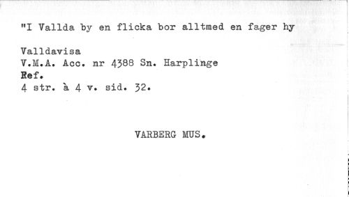 //// "I Valida by en flicka bor alltmed en fager hy //// i //// ! //// - . < < . *—.. i //// Valldavisa //// V.M.A. Acc. nr 4338 Sn. Harplinge //// Ref. //// 4 str. a 4 v. sid. 32* //// i //// VARBERG MUS. //// ' //// t= //// i //// ! //// ! ////