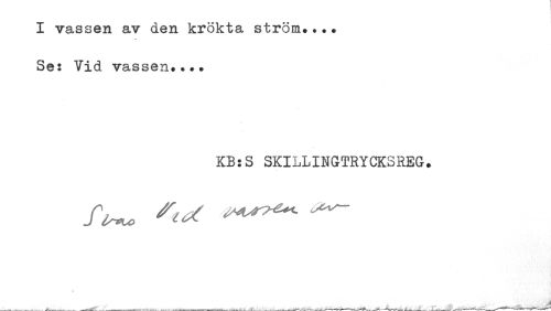 //// I vassen av den krökta ström.... //// Se: Vid vassen.... //// KB:S SKILLINGTRYCKSREG. ////