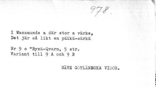 //// t //// I Wassmunds a där stor a värka. //// Det jär så likt en päikä-särkä //// Nr 9 c "Byxä-Qvam, 5 str. ! //// Variant till 9 A och 9 B i //// ! //// SÄVE GOTLÄNDSKA VISOR. //// i //// ! //// H //// H //// — ////