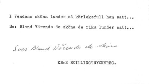 //// I Vendens sköna lundar så kärleksfull han satt... //// Se: Bland Värends de sköna de rika lunder satt... //// j, ^ . ^^ , , ^ ^ ' ^ ^ //// KB:S SKILLINGTRYCKSREG. ////