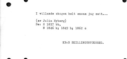 //// I villande skogen helt ensam jag satt... //// (av Julia Nyberg) //// Se: E 1837 bb, //// N 1846 k; 1849 h; 1862 c //// KB:S SKILLINGTRYCKSREG. ////