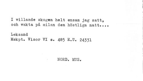 //// ) //// I villande skogen helt ensam jag satt, //// och vakta på milan den höstliga natt.... //// Leksand //// Mskpt. Visor VI s. 485 E.U. 24331 //// i //// < //// ! //// t //// i //// NORD. ms. //// I //// I ////