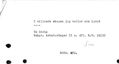 //// I villande skogen jag vallar siin hjord //// * * * * //// Gä Gävle //// Mskpt. Arbetssånger II s. 471- E.U. 24135 //// NORD. MUS. ////