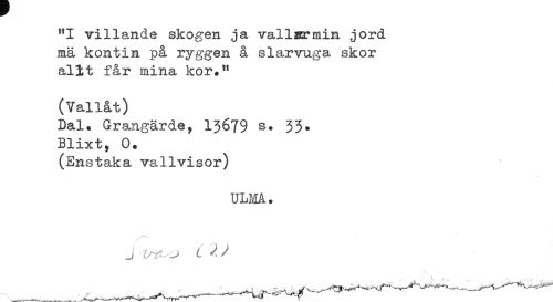 //// "I villande skogen ja vallsrmin jord //// nä kontin på ryggen å slarvuga skor //// alit får mina kor." //// (Vallat) //// Dal. Grangärde, 13679 s. 33. //// Blixt, 0. //// (Enstaka vallvisor) //// ULMA. //// J ^^ ^ ^ //// - ^ ----^^^ ////