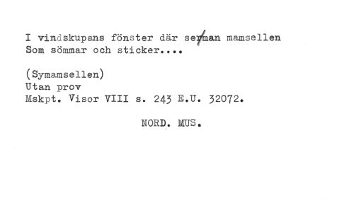 //// I vindskupans fönster där se^an mamsellen //// Som sömmar och sticker.... //// (Symamsellen) //// Utan prov //// Mskptl, Visor VIII s. 243 B.U. 32072. //// NORD. MUS. ////