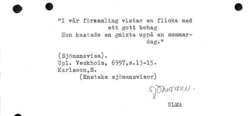 //// "I vår församling vistas en flicka med //// ett gott behag //// Hon kastade en gnista uppå en sommar- //// dag." //// (Sjömansvisa). //// Upl. Veckholm, 6997,s.13-15* //// Karlsson,S. //// (Enstaka sjömansvisor) //// - //// ULMA ////