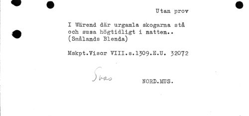 //// Utan prov //// I Wärend där urgamla skogarna stå //// ^^ och susa högtidligt i natten.. //// ^^ (Smålands Blenda) //// Mskpt.Visor VIII.S.I3O9.E.U. 32072 //// : //// i (1 //// NORD.MUS. ////