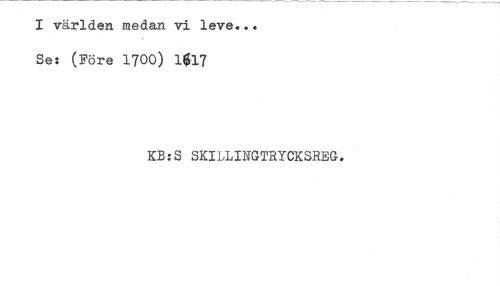 //// I världen medan vi leve... //// . .. .. . , //// Se: (Före 1700) 1$17 //// KB:S SKILLINGTRYCKSREG. ////