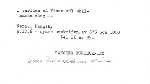 //// I verlden så finns väl skäl- //// marna mång--- //// Nerp., Rangsby //// W.10.6 - nyare omskrifvn^av 676 och 1000 //// Del II nr 951 //// RANCKEN FÖRTECKNING ////
