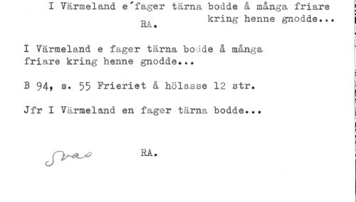 //// ^ kring henne gnodde... j //// < //// I Värmeland e fager tärna bodde å många //// friare kring henne gnodde... //// B 94, s. 55 Frieriet å hölasse 12 str. //// Jfr I Värmeland en fager tärna bodde... //// ! ////