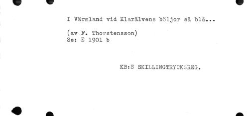 //// I Värmland vid Klarälvens böljor så blå... //// (av F. Thorstensson) //// Se: E 1901 b //// KB:S SKILLINGTRYCKSREG. ////