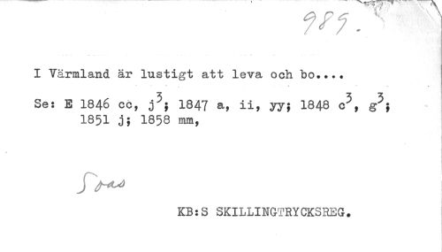 //// I Värmland är lustigt att leva och bo.... //// * *** . j * .. - //// Se: E 1846 cc, I847 a, ii, yy; 1848 c^, g^; //// 1851 j; 1858 mm, //// - //// KB:S SKILLINGTRYCKSREG. ////