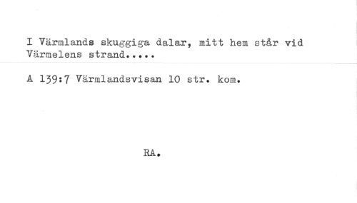 //// I Värmlands skuggiga dalar, mitt hem står vid //// Värmelens strand..... //// A 139:7 Värmlandsvisan 10 str. kom. //// RA. ////