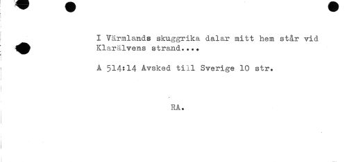 //// I Värmlands skuggrika dalar mitt hem står vid //// Klarälvens strand...* //// i //// A 514:14 Avsked till Sverige 10 str. //// ! //// j //// J //// RA. ////