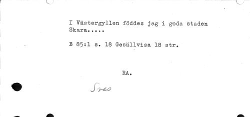 //// t //// I Västergyllen föddes jag i goda staden //// Ska,ra..... //// B 85:1 s. 18 Gesällvisa 18 str. //// * //// RA. ////