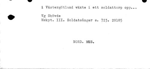 //// i Västergötland växte i ett soldattorp opp... //// ^^ Vg Skövde //// ^^ Mskpt. III. Soldatsånger s. 723. 28185 //// NORD. ms. ////