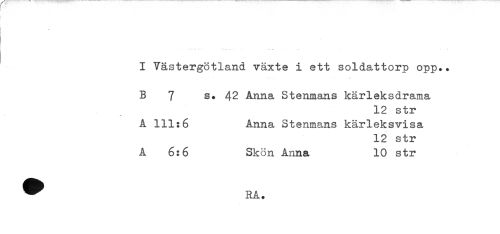 //// - //// I Västergötland växte i ett soldattorp opp.. //// B 7 s. 42 Anna Stenmans kärleksdrama //// 12 str //// A 111:6 Anna Stenmans kärleksvisa //// 12 str //// A 6:6 Skön Anna 10 str ////