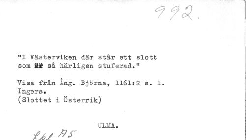 //// "I Västerviken där står ett slott //// som äå? så härligen stuferad." //// & //// Visa från Ang. Björna, 1161:2 s. 1. //// Ingers. //// (Slottet i Österrik) //// ULMA. [ ////