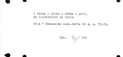 //// I väven i silke i väven i gull, //// de lindeträlöf de falla //// 22:4 ? Svenssons saml.häfte Nr 4. s. 73-74. //// ÅBO. ////
