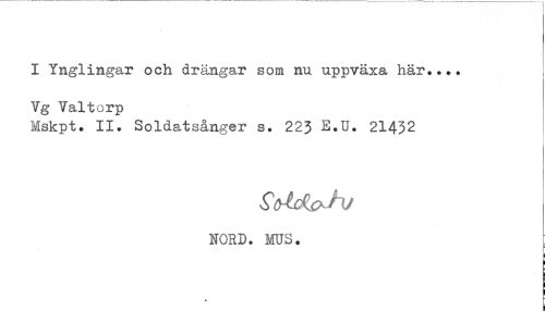 //// I Ynglingar och drängar som nu uppväxa här.... //// Vg Valtorp //// Mskpt. II. Soldatsånger s. 223 E.U. 21432 //// NORD. MUS. ////