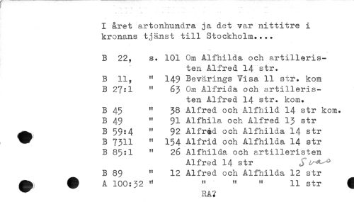 //// I året artonhundra ja det var nittitre i //// kronans tjänst till Stockholm.... //// B 22, s. 101 Om Alfhilda och artilleris- //// ten Alfred 14 str. //// B 11, " 149 Bevärings Visa 11 str. kom //// B 27:1 " 63 Om Alfrida och artilleris- //// ten Alfred 14 str. kom. //// B 45 " 38 Alfred och Alfhild 14 str kom. //// B 49 " 91 Alfhila och Alfred 13 str //// ^ B 59:4 " 92 Alfr&d och Alfhilda 14 str //// W B 7311 " 154 Alfrid och Alfhilda 14 str //// B 85:1 " 26 Alfhilda och artilleristen //// Alfred 14 str //// "R OQ " 19 Al-f-^^rl f^li Ål-fhilrla IQ ^ + ////