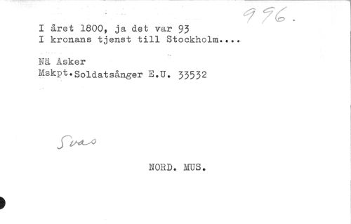 //// I året 1800, ja det var 93 //// I kronans tjenst till Stockholm.... //// Nä Asker //// Mskpt.soldats&nger E.U. 33532 //// i //// NORD. nus. //// ] ////