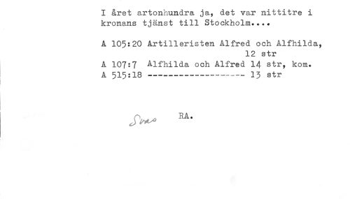 //// I året artonhundra ja, det var nittitre i //// kronans tjänst till Stockholm...* //// A 105:20 Artilleristen Alfred och Alfhilda, //// 12 str //// A 107:7 Alfhilda och Alfred 14 str, kom. //// A 515:18------- 13 str //// J'^ RA- ////