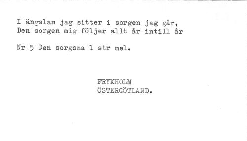 //// I ängslan jag sitter i sorgen jag går. //// Den sorgen mig följer allt år intill år //// Nr 5 Den sorgsna 1 str mel. //// FRYKHOLM //// ÖSTERGÖTLAND. ////