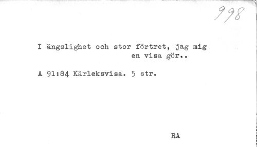 //// I ängslighet och stor förtret, jag mig //// en visa gör.. //// Å $1:84 Kärleksvisa. 5 str. //// RA ////