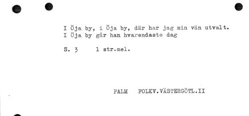 //// I Öja by, i Öja by, där har jag min vän utvalt. //// I Öja by går han hvarendaste dag //// S. 3 1 str.mel. //// PALM FOLKV.VÄSTERGÖTL.II ////