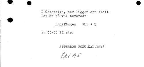 //// A # //// I Österrike, der ligger ett slott //// Det är så väl bevaradt //// Döds^&n^en Ekl A 5 //// ti //// i //// ' s. 33-35 12 str. //// ATTERBOM POET.KAL.1816 ////