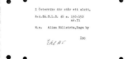 //// ! I Österrike där står ett slott, //// 8:4.SA.S.L.S. 40 s. I5O-I52 //// nr. 71 //// M.a. Alina Hällström,Haga by //// ÅBO ////